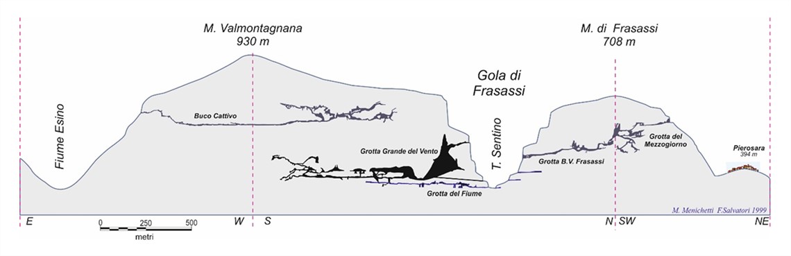 Fig. 2 – Schema semplificato dei sistemi sotterranei delle Gole di Frasassi (Menichetti e Salvatori, 1999)